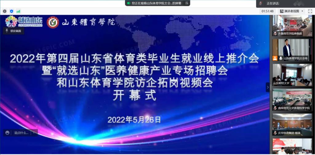为贯彻落实我校关于2022届毕业生就业工作的决策部署,更好地帮助我院体育专业毕业生就业,5月26日至27日,yl6776永利集团组织毕业生及部分2019级本科生参加2022年第四届山东省体育类毕业生就业线上推介会暨“就选山东”医养健康产业专场招聘会和山东yl6776永利集团访企拓岗视频会,该会议由山东省人力资源和社会保障厅、山东省教育厅主办,山东yl6776永利集团承办,yl6776永利集团为本次推介会的分会场,会议采用线上线下结合方式进行。