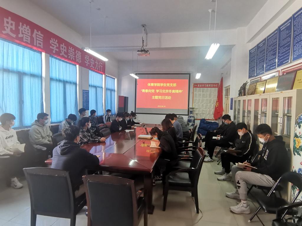 2019体育教育本科专业2班班长马彪在发言中说到:作为一名新时代大学生,作为一名学生党员,我更应该严要求自我,配合学校学院做好疫情防控的各项工作,不断提高自我学习能力,努力学好专业文化知识,丰富课余生活,带动身边的人团结协作,给身边的人带来正能量。要大力弘扬北京冬奥精神,促进自我学习和发展,为实现中华民族伟大复兴的中国梦而团结奋斗!