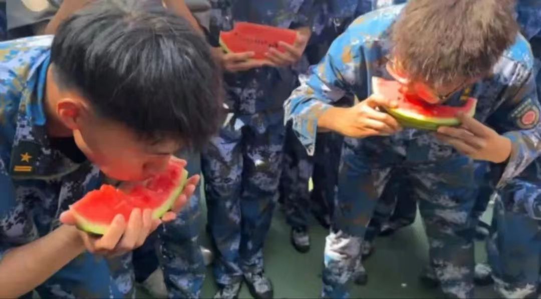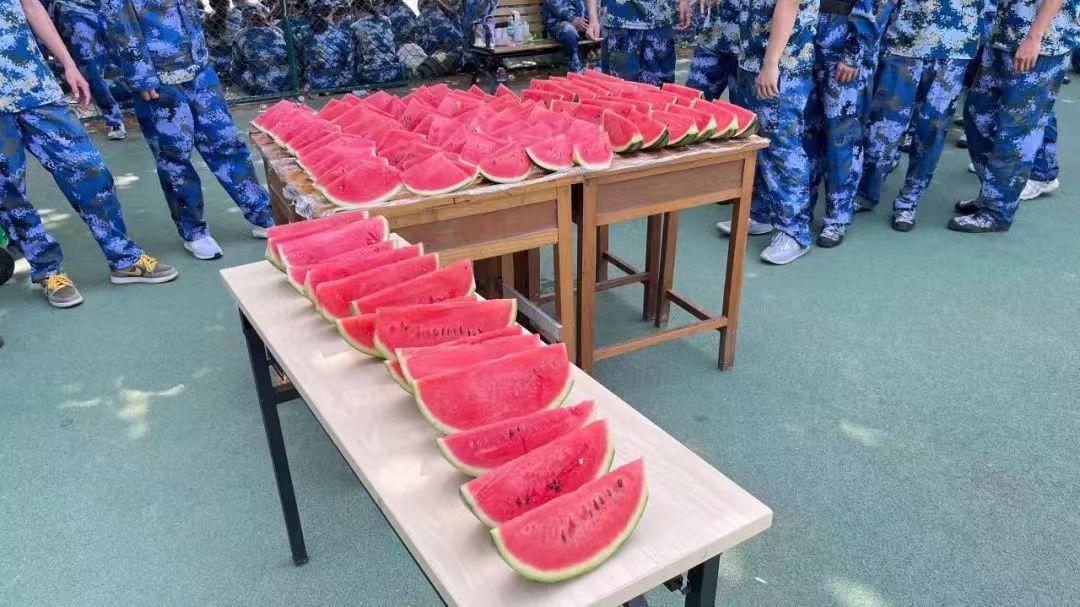 随着同学们的欢呼声和呐喊声,西瓜汁溅落在操场上,青春也绽放在这珍贵的岁月里。比赛结束后,吃西瓜时间最慢的一组为大家表演了精彩的节目。此次吃西瓜比赛,加强了同学们之间的沟通,增进了彼此的感情,活跃了文化氛围。在丰富学生课余生活的同时,也在炎热的夏季为大家带来一份清凉。希望同学们在接下来的训练中能继续遵守纪律,不畏辛苦,磨练意志。