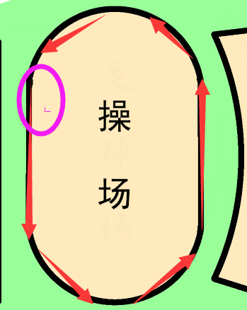圆圈内表示集合地点,ABCD四组所有学院跑完各自圈数回到集合点集合,七点二十正式下早操。