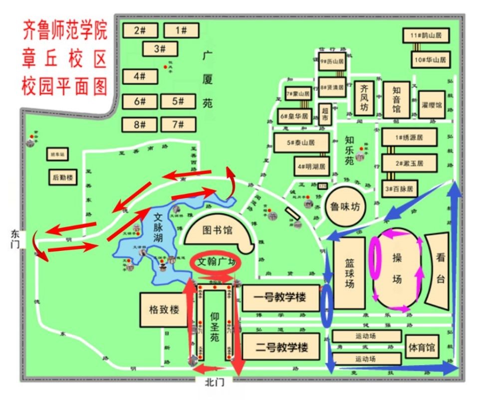 D组齐鲁师范园到东门折返集合地点为齐鲁师范园门口自东向西依次按照上述学院先后顺序排开集合,跑一圈。