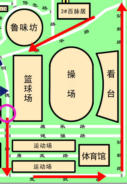 C组操场篮球场看台外围大圈集合地点为一号教学楼前自南向北依次按照上述学院先后顺序排开集合,跑一圈。
