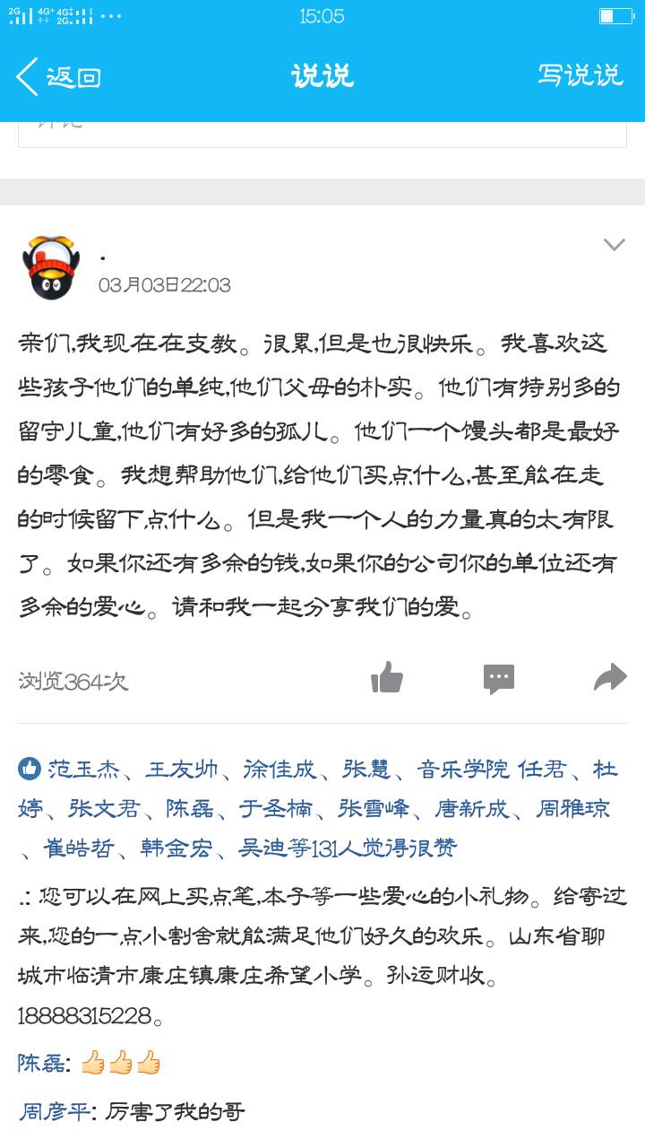 “亲们,我现在在支教。很累,也很快乐。我喜欢这些孩子们的单纯朴实。他们有特别多的是留守儿童,他们中有好多的孤儿。他们一个馒头都是最好的零食。我想帮助他们,给他们买点什么,甚至能在走的时候留下点什么。但是我一个人的力量镇的太有限了。如果你还有多余的钱,如果你的公司你的单位还有多余的爱心。请和我一起分享我们的爱。”——这是孙运财3月3日22:03发出的第一份倡议。