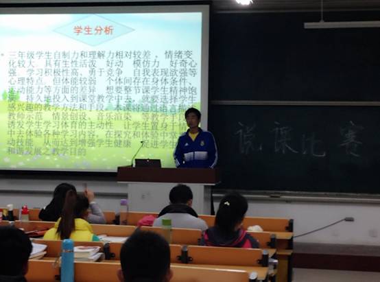 2011级本科班一百多名学生积极参加,各自准备了图文并茂的PPT,配之专业全面的讲解词,为老师和同学奉献了一场百家争鸣的学术展示。比赛过程井井有序,气氛活跃,在如此氛围下,同学们掌声如潮。其中表现尤为抢眼的选手有体教二班的于浩、体教一班金帅、体教三班李松赞、体教四班赵志浩等。最终评委进行了点评与评阶,称赞了学生讲课时生动出彩的亮点,也指出需要注意改进的部分,为学生后续的比赛和今后的工作都提出中肯的意见。