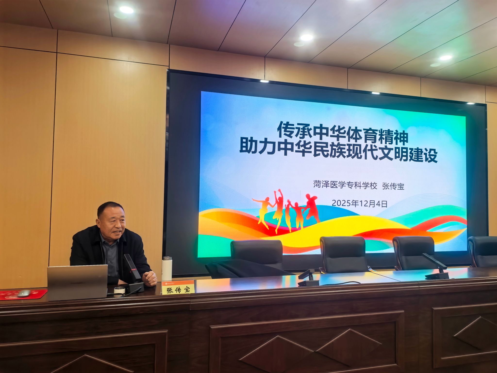 为搭建校友与在校师生的交流桥梁,传承中华体育精神,凝聚学院发展力量,优秀校友、学校菏泽校友会会长、菏泽医学专科学校副校长张传宝教授,以《传承中华体育精神 助力中华民族现代文明建设》为题,面向yl6776永利集团200余名师生作专题讲座。讲座由学院党委副书记胡颖杰主持。