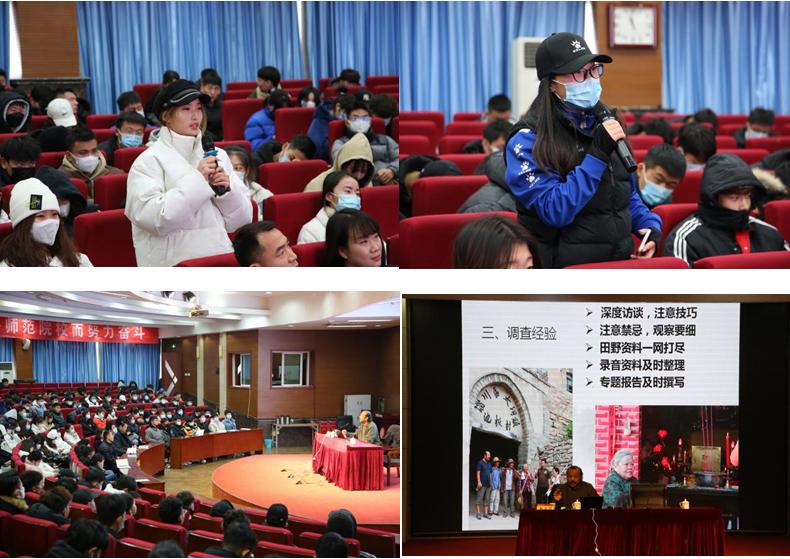 在专题讲座环节,张士闪教授以个人成长经历与学习工作历程为切入点,从武术本体、武术生态、调查经验、报告撰写等四个方面对齐鲁传统武术资源调查进行了专题讲解。无处不田野,张士闪教授指出,进行田野调查研究,要做好充足的前期准备,在访谈中要贴近人、贴近生活,要认真聆听每个人自己的生活文化,找寻与访谈者之间的文化共情的链接点。张士闪教授从身承技艺、口承叙事、物承器物、书承文献四个角度分析了武术本体的结构层级;从人、武术、社会、文化四个单元对开展武术田野调查的内容展开详细讲解。张士闪教授语言幽默风趣,为同学们讲述了他的亲身经历与体会,整场讲座气氛活跃,老师和同学们有极强的兴趣和代入感,较为深入地理解了在开展武术田野调查中所要注意的诸多因素,对武术田野调查也有了新的认识。