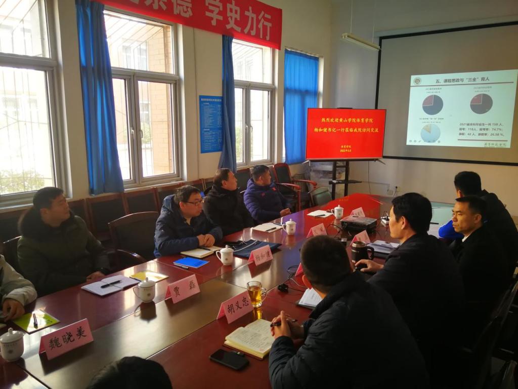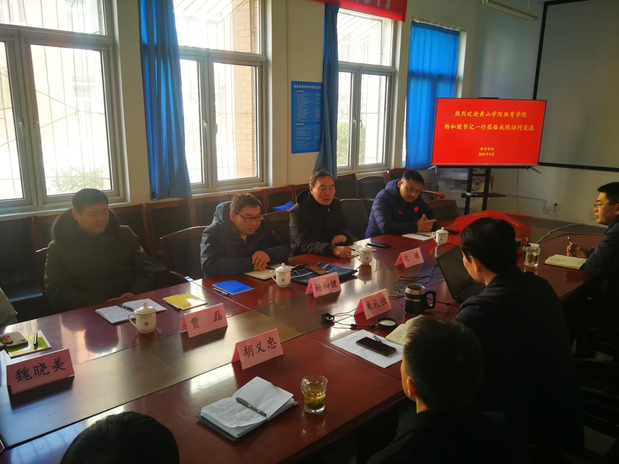 3月3日上午,黄山学院yl6776永利集团党总支书记杨和健一行五人来我校yl6776永利集团交流工作。yl6776永利集团院长朱礼恒、党总支书记胡义忠、副院长贾磊及公共体育教研室的有关负责同志接待来访人员,并共同出席了交流座谈会。