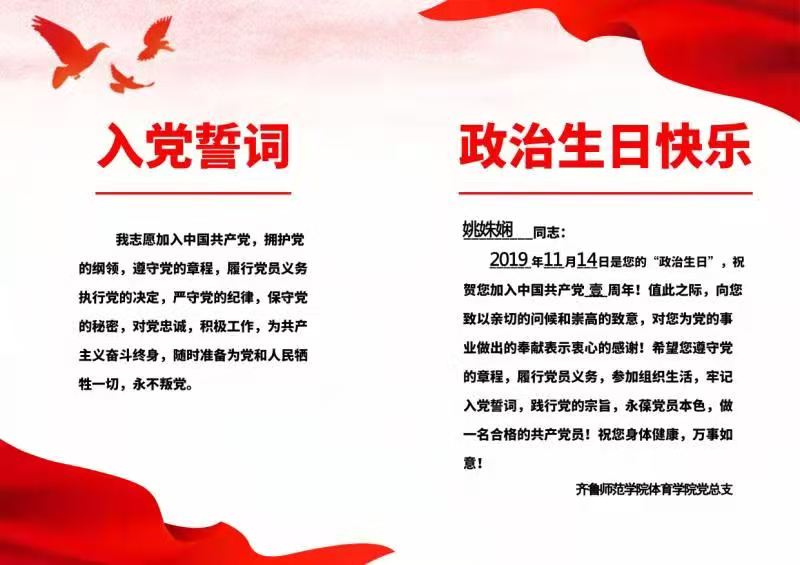 “尊敬的闫莉莉老师,我带着感恩与真诚的心向您说一声:谢谢。是您让我认识了党,是您介绍我加入了党组织,2019年11月14日是我的政治生日,我会牢记这一天,牢记您对我的谆谆教诲。在今后的学习生活工作中,我将以优秀党员为标杆,见贤思齐、即知即改,不断提高为人民服务的本领,要一辈子做一名忠于党、忠于人民的合格党员。”这是刚刚转为中共正式党员的杨柳在她政治生日当天,写给入党介绍人的一封信。