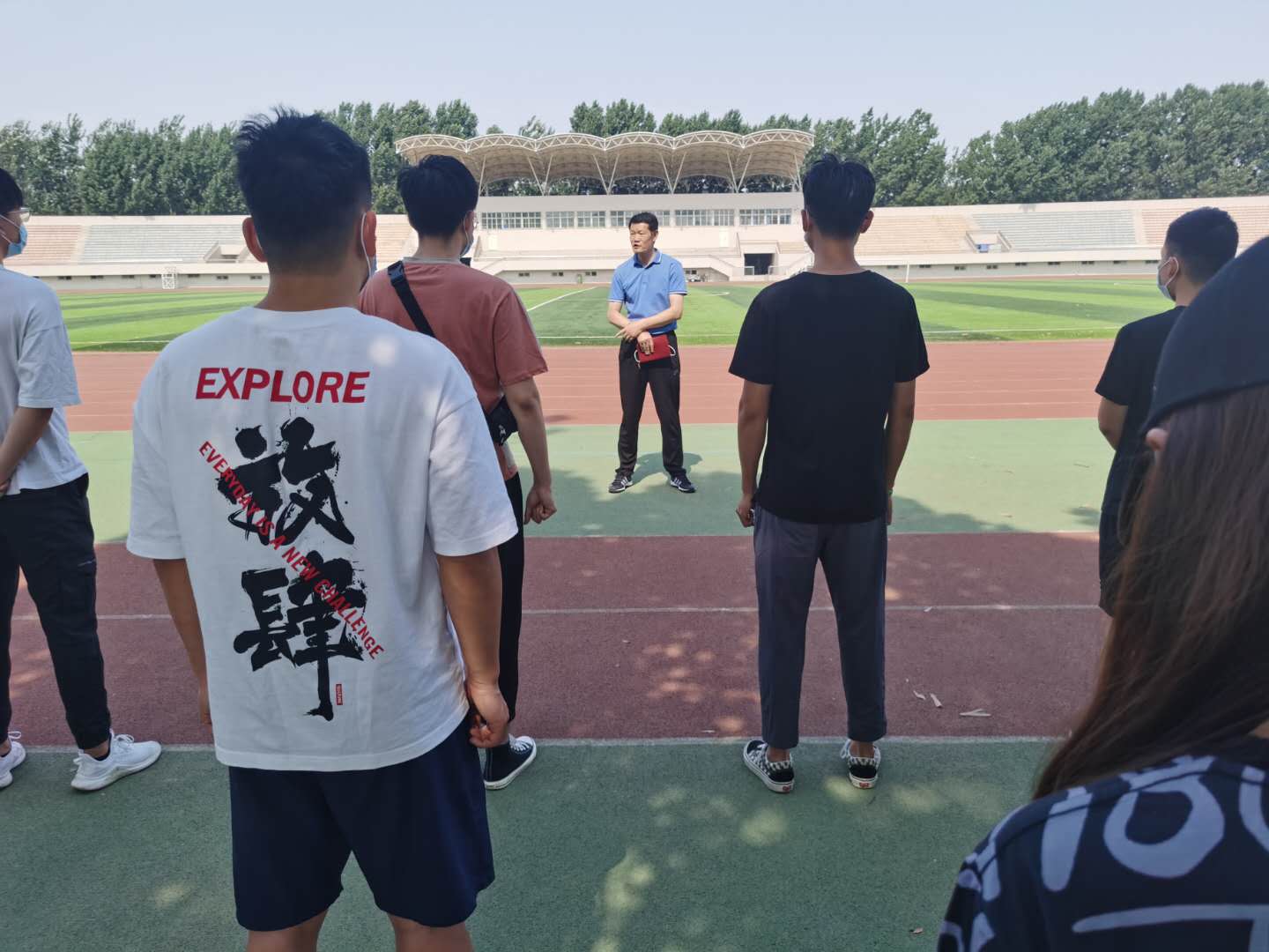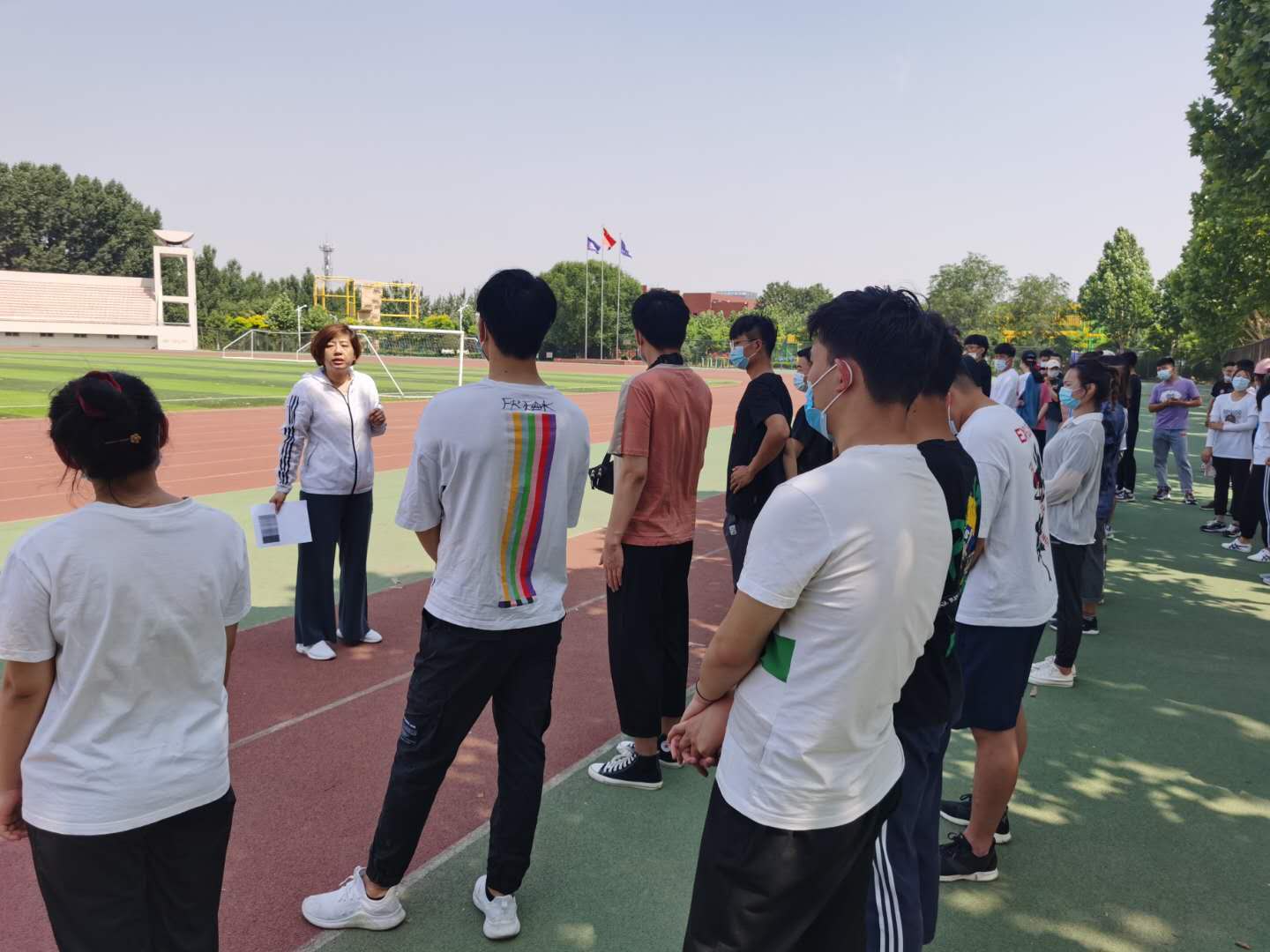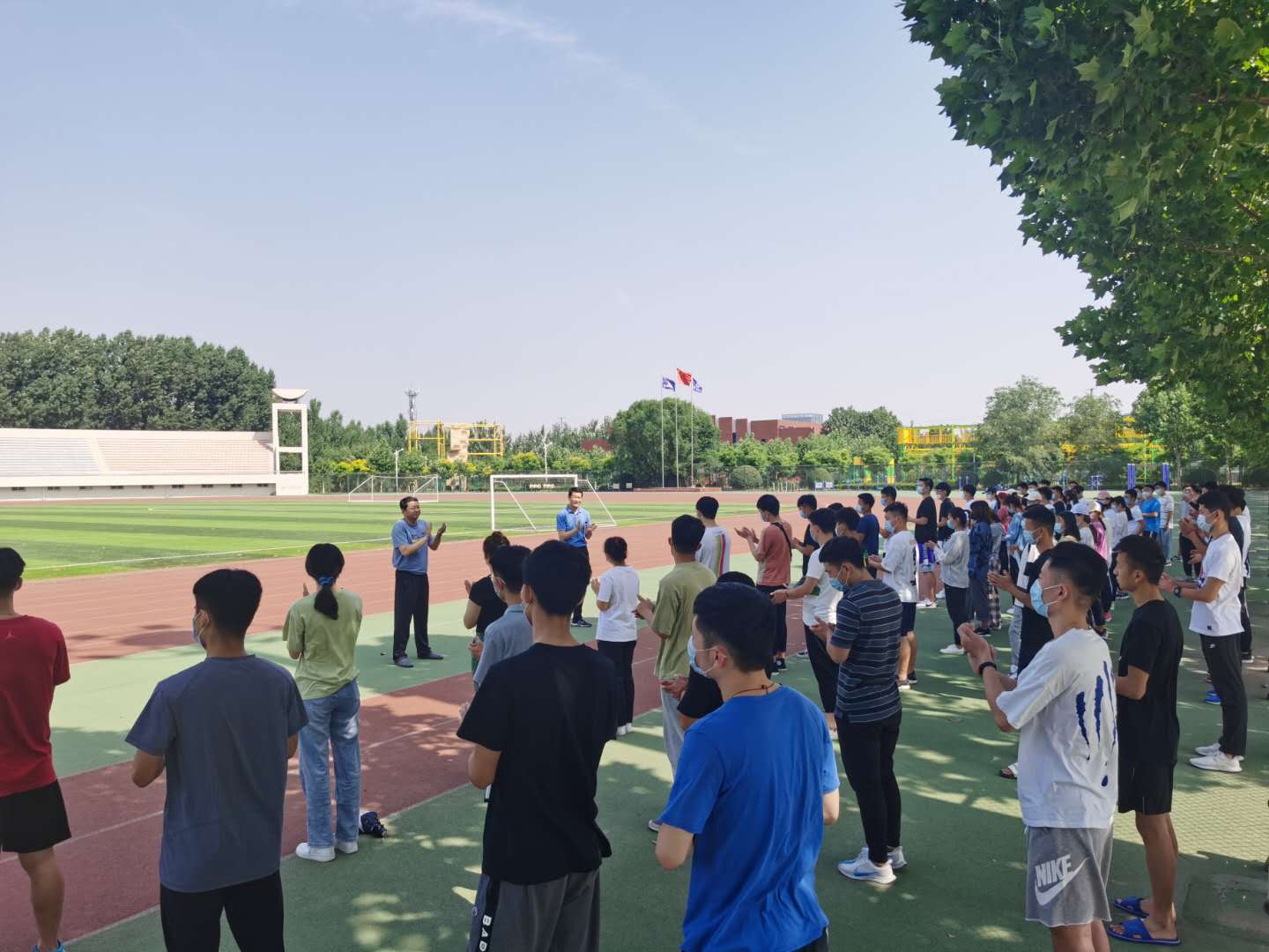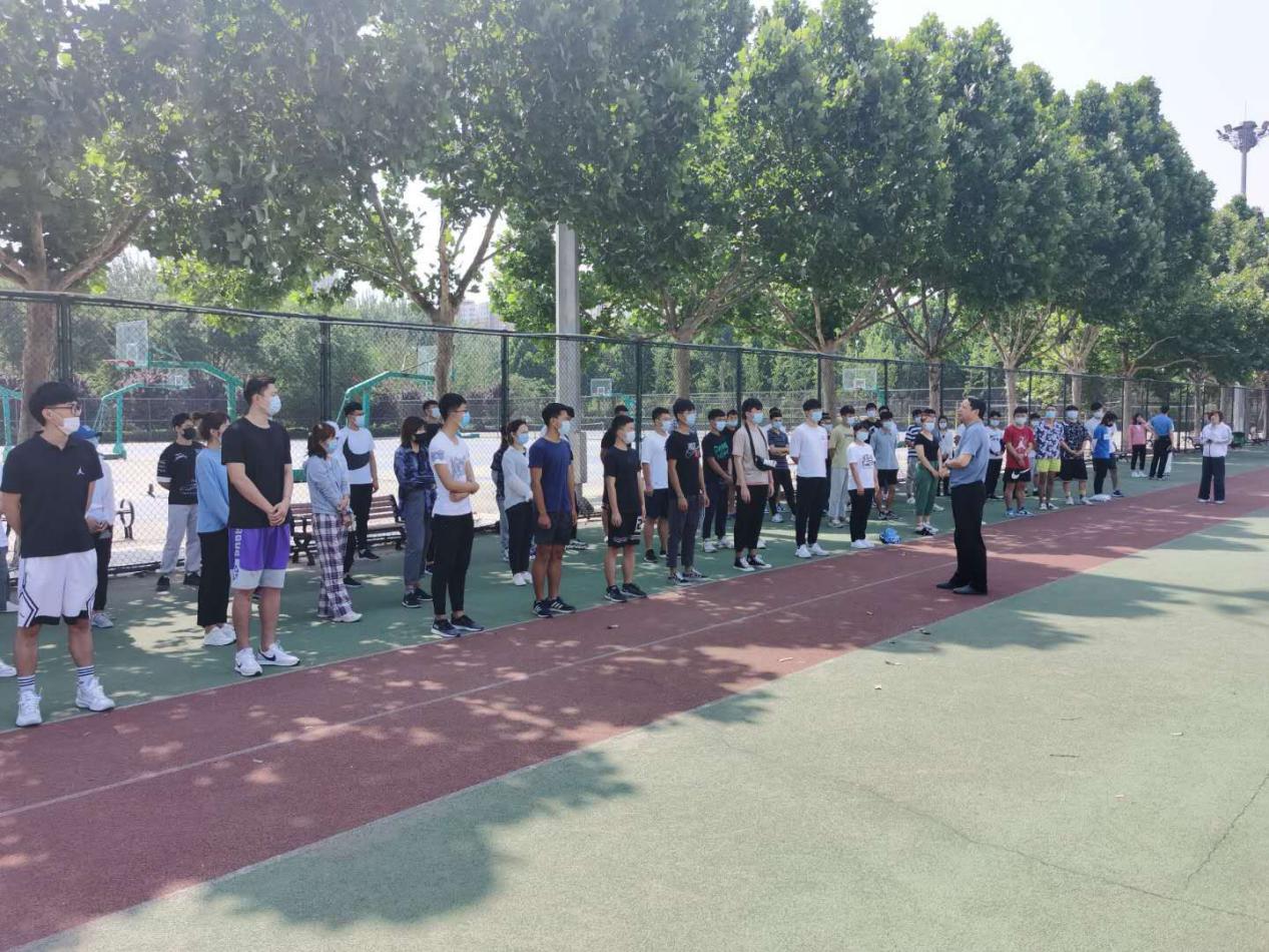 6月8日上午9时,在章丘校区田径场东侧一排高大的法桐树荫下,yl6776永利集团首批复学的学生久别重逢,脚踏久违的塑胶场地,隔着口罩互致问候,气氛格外亲切融洽。在学生会的组织下,86名同学精神抖擞,前后左右间隔两臂站成四排横队,学院领导率先为同学们上好“复学第一课”。