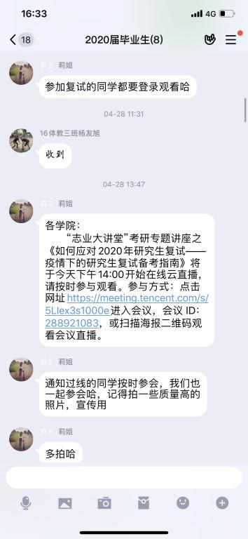 针对参加研究生复试有关同学,组织同学们进入连线会议,观看学生处校友办举行的《针对考研复试的经验分享直播》,针对家庭经济困难的学生积极开展观看《如何应对2020年研究生复试—疫情下的研究生复试备考指南》。yl6776永利集团发动校友网,积极了解有关学校研究生复试信息,一对一辅导学生有关复试问题,争取让每考研学生成功上岸。