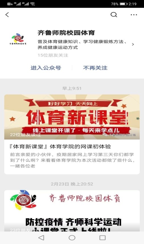 yl6776永利集团本学期主要承担全校通识必修课大学体育与健康课程和yl6776永利集团5个专业的课程教学任务,根据学校教务处下发的《6776永利集团关于对延期开学开展线上教学的通知》、《关于做好2019-2020学年度第二学期延期开学期间开展网络教学工作的预案通知》等文件的要求,yl6776永利集团认真做好网络授课的各项准备工作,制定了yl6776永利集团开展网络教学工作的预案, 2月23日之前190余个通识必修课大学体育课堂和专业课堂全部建设完成。为了让广大师生在疫情期间能得到更便利的体育锻炼平台,我们创建了“齐鲁师院校园体育”订阅号,面向全体师生普及科学健身和居家锻炼的相关知识。