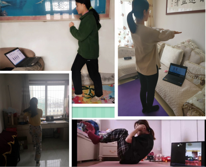 让学生坐下来学习理论知识的同时,我们也体现专业特色,让学生因时因地“练起来”,各位老师根据项目特点制定了居家训练计划,让学生们做好专项体能储备,学生每天按时进行锻炼打卡,并上交作业,教师及时纠错。
