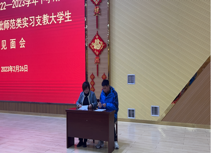 2023年2月26日上午,yl6776永利集团2023年援疆第一批师范类实习支教大学生见面会在麦盖提县第四中学学术报告厅隆重召开。yl6776永利集团援疆实习支教团全体师生参加会议。此次会议也标志着我院选派的15名实习支教大学生肩负使命,正式走上工作岗位,本次会议由玉苏甫江·艾合买提主任主持。
