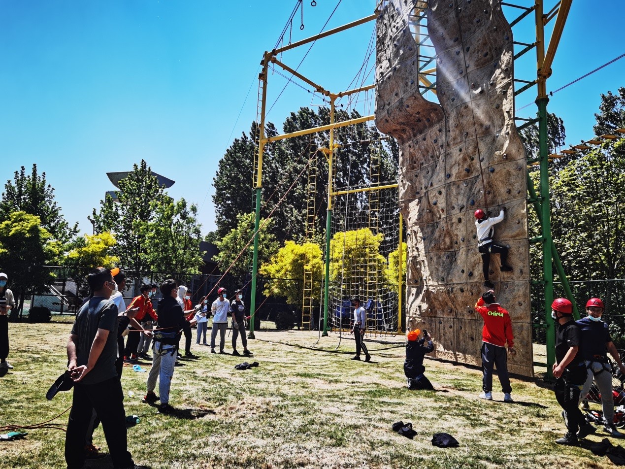 各组完成两个主场区拓展任务后,推选出“精英强将”参加高空攀岩项目比赛。12米高的“攀岩”墙上,先后有20多名教职工不畏艰险,迎难而上,展现出师院教职员工敢于担当、敢于挑战的师者本色。