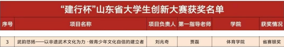 由山东省教育厅主办的“建行杯”山东省大学生创新大赛(2025)在山东科技大学黄岛校区圆满落幕。我院“武韵悠扬——以非议武术文化为动力·做青少年文化自信的建立者”项目一路过关斩将,最终在该大赛中斩获银奖,实现了在该领域参赛成绩的历史性零突破。
